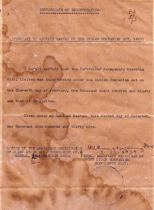The Tiruvallur Janopakara Saswatha Nidhi Ltd is a company incorporated under The Companies Act - Nidhi Rules Incorporation on 11 February 1890. It is classified a Non-govt company and is registered with Registrar of Companies, Chennai. Its authorized share capital is Rs. 45,00,000 and its paid up capital is Rs. 33,53,060. It is involved in Activities auxiliary to financial intermediation, except insurance and pension funding. Financial Services are extended to Members only.